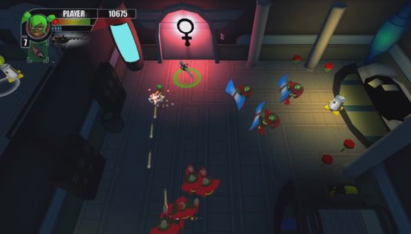 Finally we come to the actual gameplay itself. Rocketmen is at its core a top down run-n-gun shooter presented in a sightly isometric view. There are a few problems with how this is handled though. The camera is zoomed in so far and you have to get so close to the edge of the screen to get it to move that often you find yourself jumped by enemies who were hiding just offscreen. There is a decent variety of weapons presented and some hints of more good ones be found. In addition the game presents a very promising amount of character leveling and customizability. In all, though, it's really just not enough to save the overall experience. After all, who wants to try and level their character further when the gameplay and presentation stink as bad as they do.