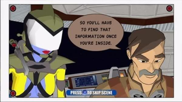 The next thing you are confronted with are the cutscenes which introduce you to the story. The game aims for something like a cheesy 50's era sci-fi feel but it just comes off very poorly. The voice acting used is terrible... really terrible. I have seen YouTube videos with better voice work. The cut scenes are also presented in a pseudo-comic book sort of way with animation separated by frames. While this can be an excellent method of storytelling (see Folklore) here it is just pointless. The frames and onomatopoeia emphasized sounds are simply frivolous additions. Finally, the cel-shaded graphics used to presumably help pull off the comic presentation are poorly done as well. I have seen much better on Dreamcast Jet Grind Radio than what's presented here.